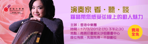 箏的音色一向予人清幽淡雅感覺,香港中樂團箏演奏家羅晶將為大眾分享她學箏的好奇事、成為箏演奏家的要訣等,羅晶更會即席示範樂曲,分享演奏技巧,對中樂有興趣的朋友不容錯過!
